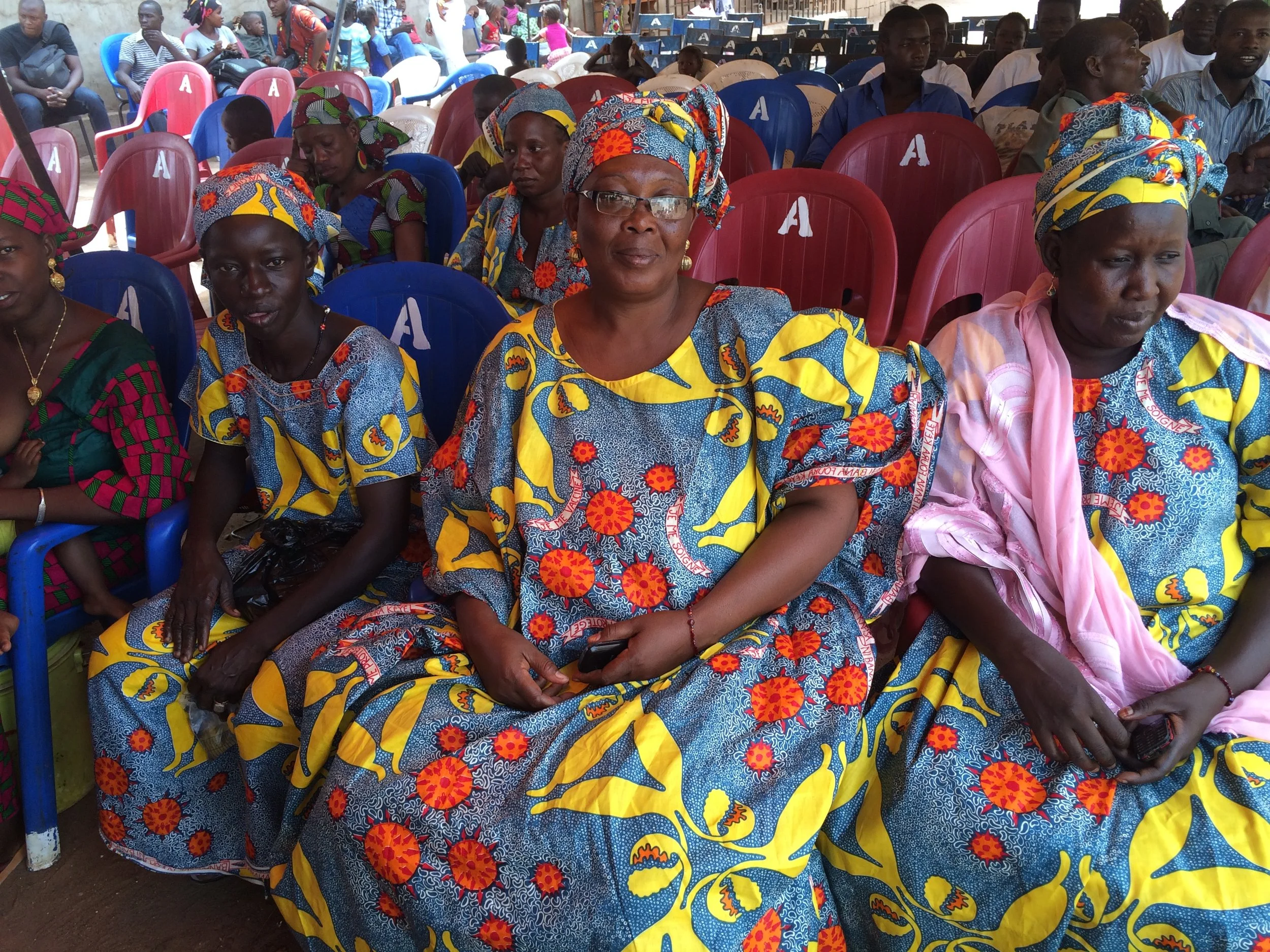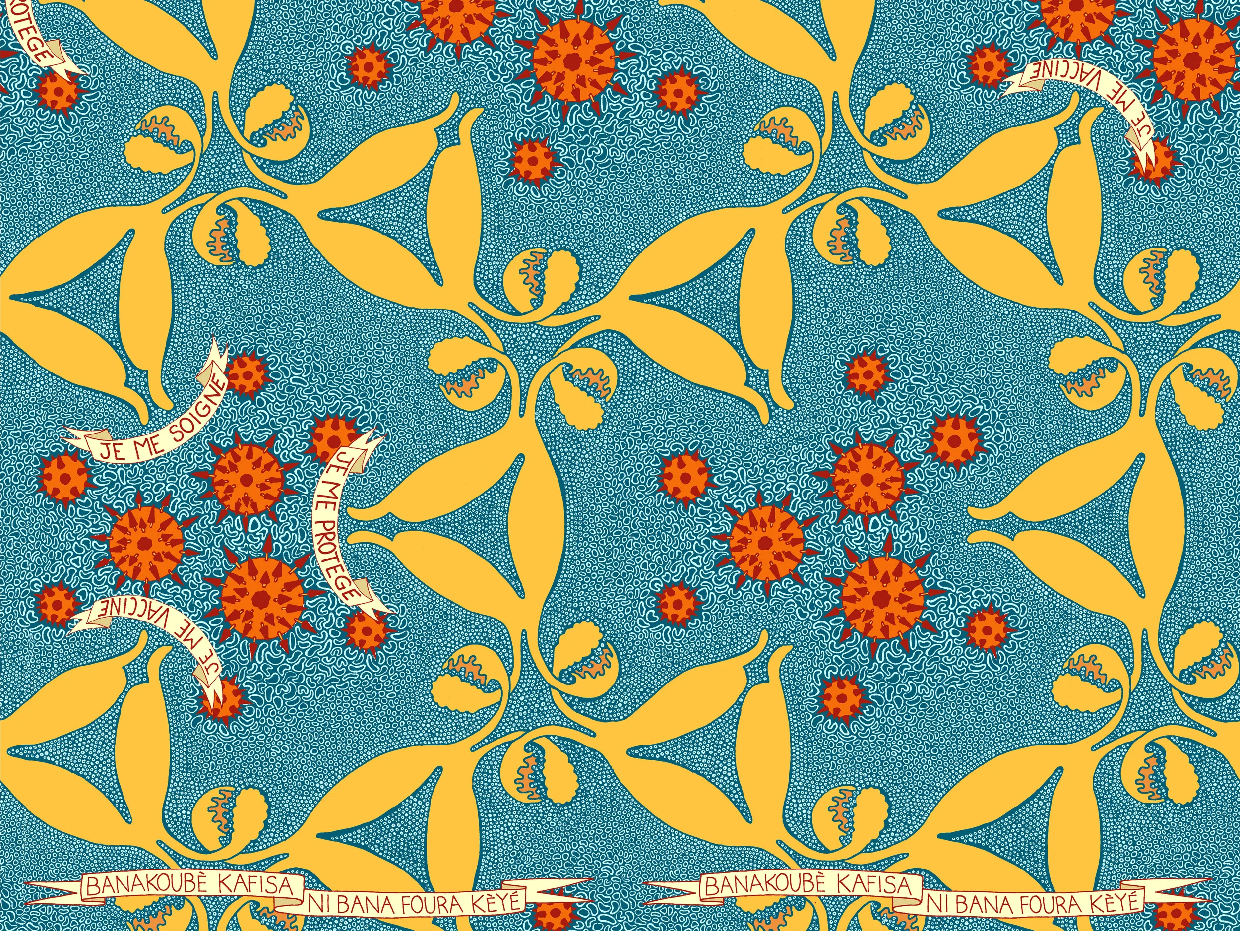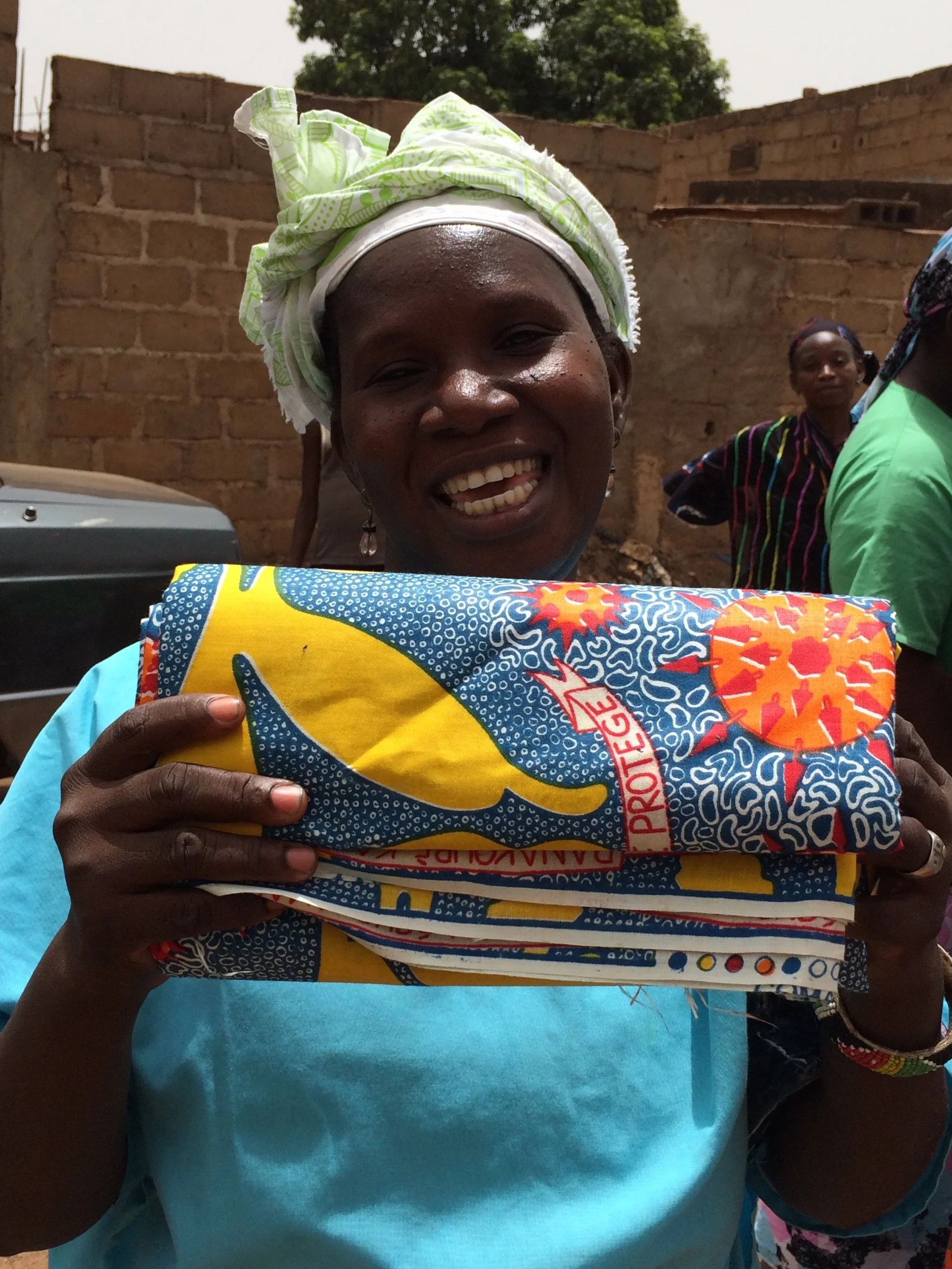 HPV cloth: HPV viruses are embedded in cancerous cells. Healthy uterus and cervix are surrounded by healthy cells. French slogan reads "I care for myself, I protect myself, and I get vaccinated". Bambara proverb reads "It is better to prevent than cure". Together, we fight against HPV and cervical caner!