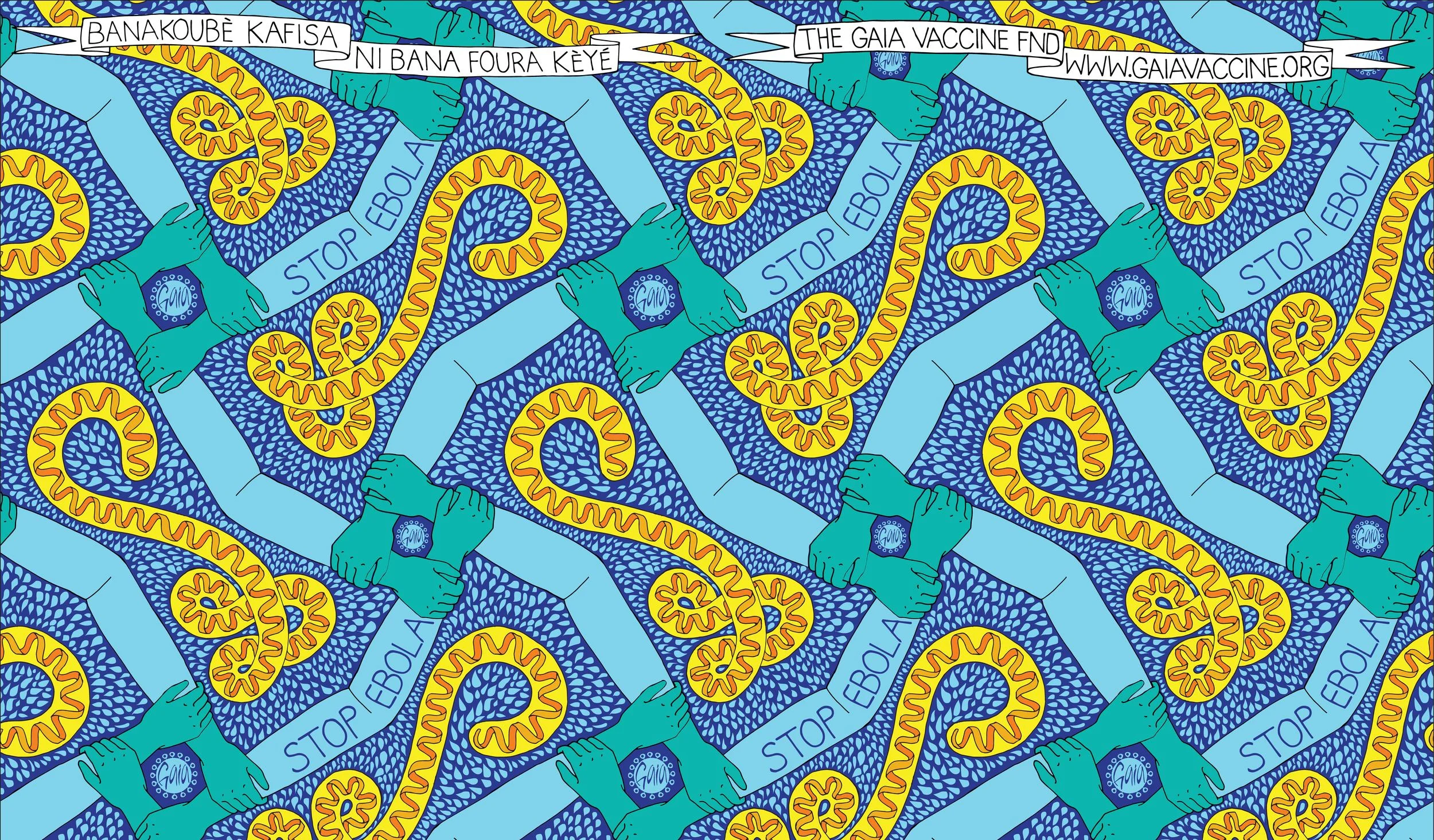 Ebola Prevention: The ebola virus is depicted with protecting health worker arms preventing the spread of bodily fluids. Bambara proverb reads "It is better to prevent than cure".